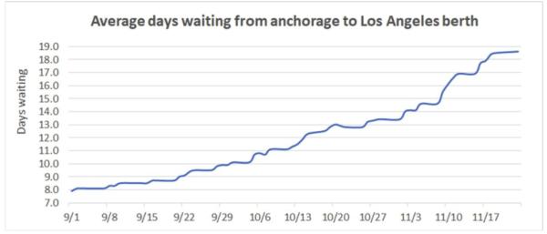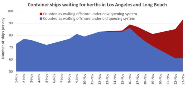 根據(jù)最近南加州海運交易所公布的數(shù)據(jù),11月16日,在洛杉磯/長灘港近海等待的集裝箱船數(shù)量達到驚人的86艘,一周后,這個數(shù)字驟減,降至61艘,降幅達到29%,創(chuàng)下自10月初以來的最低值。