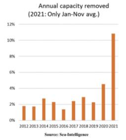 Sea-Intelligence的數(shù)據(jù)顯示,疫情前,通常有2%的集裝箱船運(yùn)力陷入延誤,而這一數(shù)字在2021年飆升至11%。