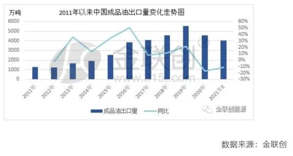 過去10年,我國成品油出口量年均增幅超過10%,2019年達到5537萬噸的歷史高位水平。2020年受國際疫情影響,成品油出口增長率由正轉負,為2013年以來首次負增長。此外,隨著雙碳目標提出,2021年成品油出口政策收緊,預計全年出口量繼續(xù)減少11.5%至4050萬噸,汽、柴、煤分別出口1480萬噸、1700萬噸、870萬噸,同比降幅分別為7.8%、13.5%、13%。