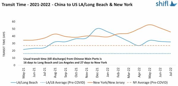盡管在美國東海岸等一些地區(qū)一直有港口擁堵的報道,但主要航線的運輸時間卻在下降。Shifl報告稱,通往美國東海岸的航線運輸時間在4月份達到了50天的高峰,目前已下降到平均46天。