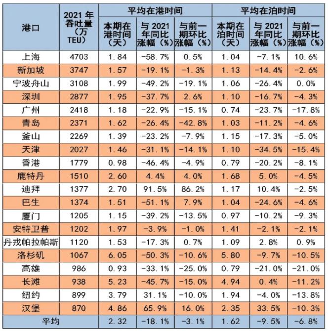 船舶在港時間是指船舶抵達港口待泊錨地到靠泊完成裝卸作業(yè)離開泊位之間的總時長。該指標集中體現(xiàn)了港口設(shè)施設(shè)備、引航、調(diào)度、裝卸、集疏運、口岸通關(guān)等綜合效率。